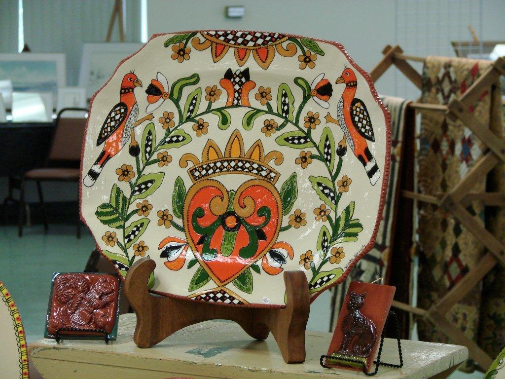 Selinda has developed her own signature in developing her own line of redware ceramic platters, bowls and decorative tiles. She employs 17th, 18th and 19th century motifs, inspired by famous examples of folk art found in museums and private collections. These traditional designs are derived primarily from German folk art imagery: song and book plate vignettes, powder horn engravings, and fraktur patterns. Using a traditional drape mold technique she utilizes antique forms in a variety of shapes and sizes for her canvas in redware. Through research of period designs she creates a unique collection of symbolic images combined with new color and detail. Each piece is hand-decorated with brushes and fine detail using engobes and glazes and fired in her kiln.
