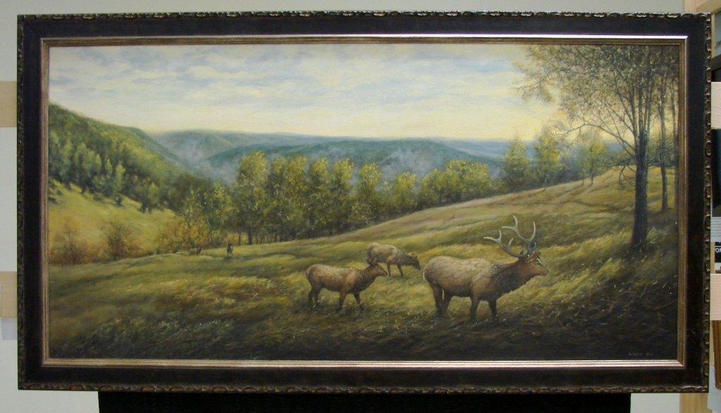 Steve has a passion for 19th century art and in particular the Hudson River School artists and their use of dramatic light with landscapes. Homer, Church, Cassatt, Eakins, Bierstadt, Remington, Whistler are a few artists from whom he draws inspiration from when creating his paintings. While Steve experiments with techniques and styles he describes his art as modern realism. He attempts to create emotion in everything he paints – the dramatic crepuscular rays of sun coming through the clouds or subtle reflections of the moonlight on a snowy field interest him. Most of the time Steve paints scenes from Central Pennsylvania and loves landscapes – with amazing light and color – and natural subjects like a stream bank.