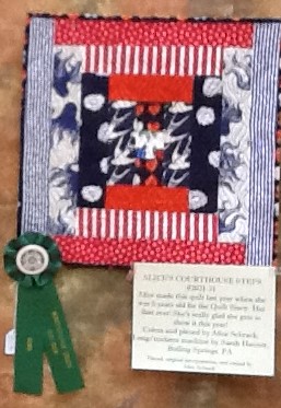For hand quilting, Karen Shipton, Mifflinburg, took first and second place, and Nancy Celline was third place; Nancy Simmons and Abigail Appleman were first and second place winners in the domestic/hand-guided machine quilting category; and Nancy Eischeid, Jo Ellen Freida and Amanda Hasemeier won first, second and third place honors in the computer-guided machine category. Lana Miller, Annette Foresman and Susan Ball Faeder were wall hanging winners; G. Ruggiero, Mary Jean Bower and Abigail Appleman took the Contemporary category. Alice Schrack’s entry, “Alice’s Courthouse Steps,” received a rosette in the Youth Category.